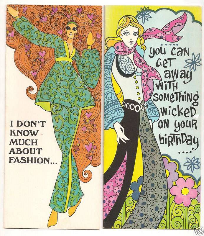 1969 Mod Hippy Fashion greeting cards Groovy Art February 2010 Ebay description: Both are unused, come with envelopes and are published by SCM Allied Paper Co, Chicago 1969. Awesome graphics are 4" x 9" and frameable if you wish.