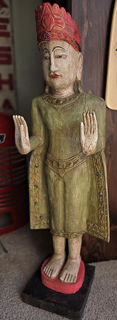 | Below - According to the tag on it, this is a Burmese-style Buddha wooden carving in the Abhaya Mudra posture. It is 3 feet tall. I bought it in the Kalamazoo Antique Mall in March 2026. |